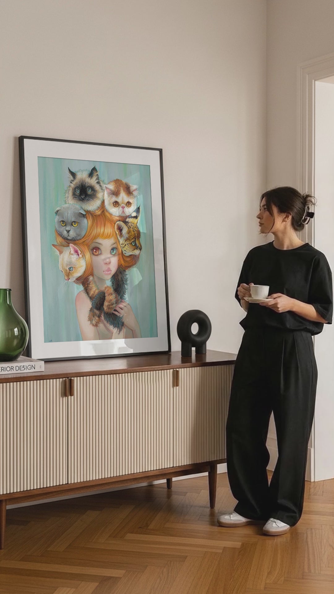 Introducing "Catitude," a purrfect new open edition print that embodies the spirited essence of feisty feline companionship. This painting celebrates the independence and quirky nature of cats. Just like the girl in the artwork, kitties exude a formidable will, allowing affection only on their terms—a testament to their mysterious charm. So if you are crazy for cats, or have a fabulous friend who can’t get enough of these fuzzy furballs, this is the perfect print to adopt into your home!