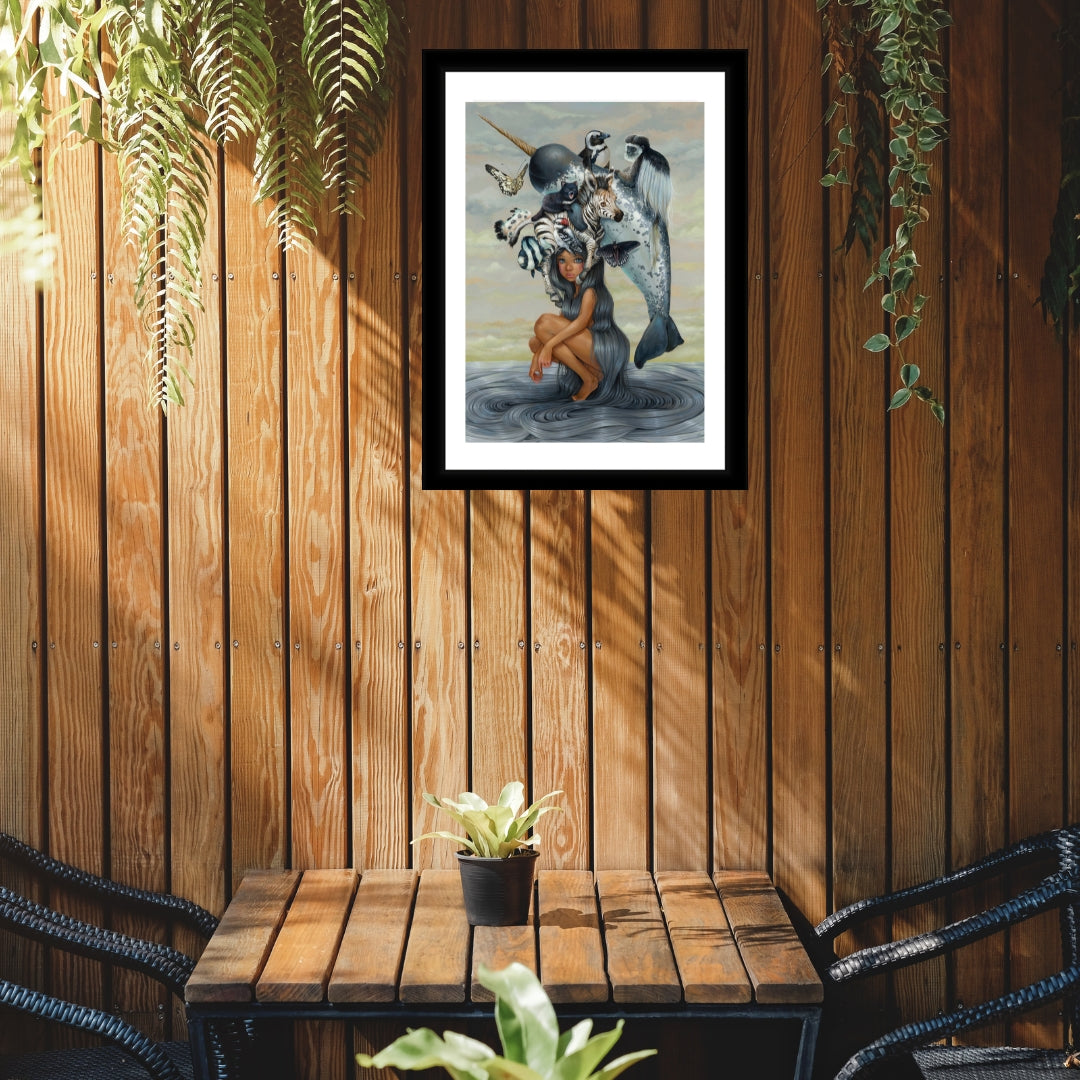Adéntrese en un mundo de maravillas con "El Zoológico de Malina". Esta cautivadora pintura retrata a una joven con una melena ondulante que parece fundirse a su alrededor como si fuera el océano mismo. Coronada por una variedad de animales exóticos que representan la belleza de la diversidad de la naturaleza, Malina se mantiene en el centro de este paisaje surrealista como un pilar de vida. Un narval, una cebra, mariposas y una colección de otras criaturas únicas parecen encontrar refugio sobre su cabeza, transformándose en una caprichosa diadema de vida. Su mirada dulce y misteriosa invita al espectador a reflexionar sobre su conexión con el mundo natural. Con suaves tonos pastel y un movimiento dinámico, esta pieza celebra la armonía, la naturaleza salvaje y la belleza de ser uno con las criaturas que nos rodean. Disponible en edición abierta y en una vibrante impresión láser digital de 28x35 cm que da vida a cada detalle. Perfecta para cualquier amante de la naturaleza o coleccionista de arte que encuentre magia en la coexistencia de la humanidad y la vida silvestre.
