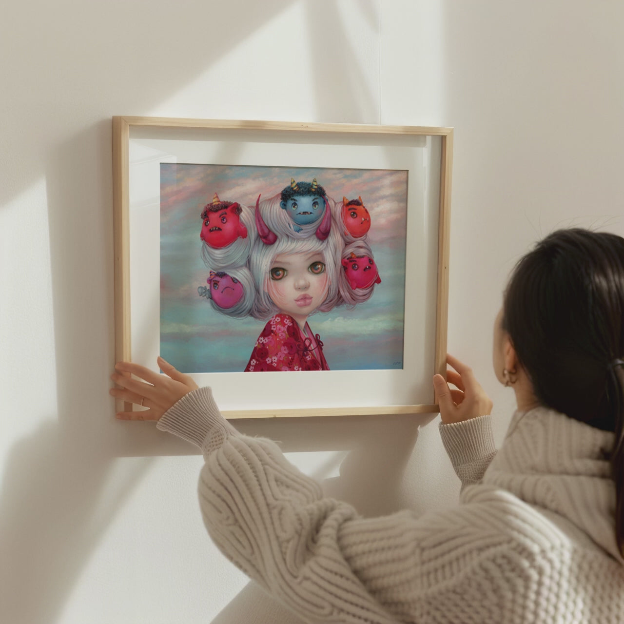 Do you believe in supernatural things? "Devil-may-hair," inspired by Japanese Oni folklore, captures the imagination with its enchanting design. Oni are traditionally seen as fearsome demons in Japanese culture, but in this artwork, they appear deceptively cute—though beware, they might still bite if you get too close! This piece debuted at the Yokai Group show in May 2024. A fun fact about this painting is that one of my Patreon subscribers suggested its delightful name. Now, it will debut as a new open-edition print on my website, perfectly timed for the season. Select your ideal size and paper type to enhance your décor and express your style. Whether it graces your home, office, or any space needing a dash of supernatural flair, this print is designed to captivate and inspire.
