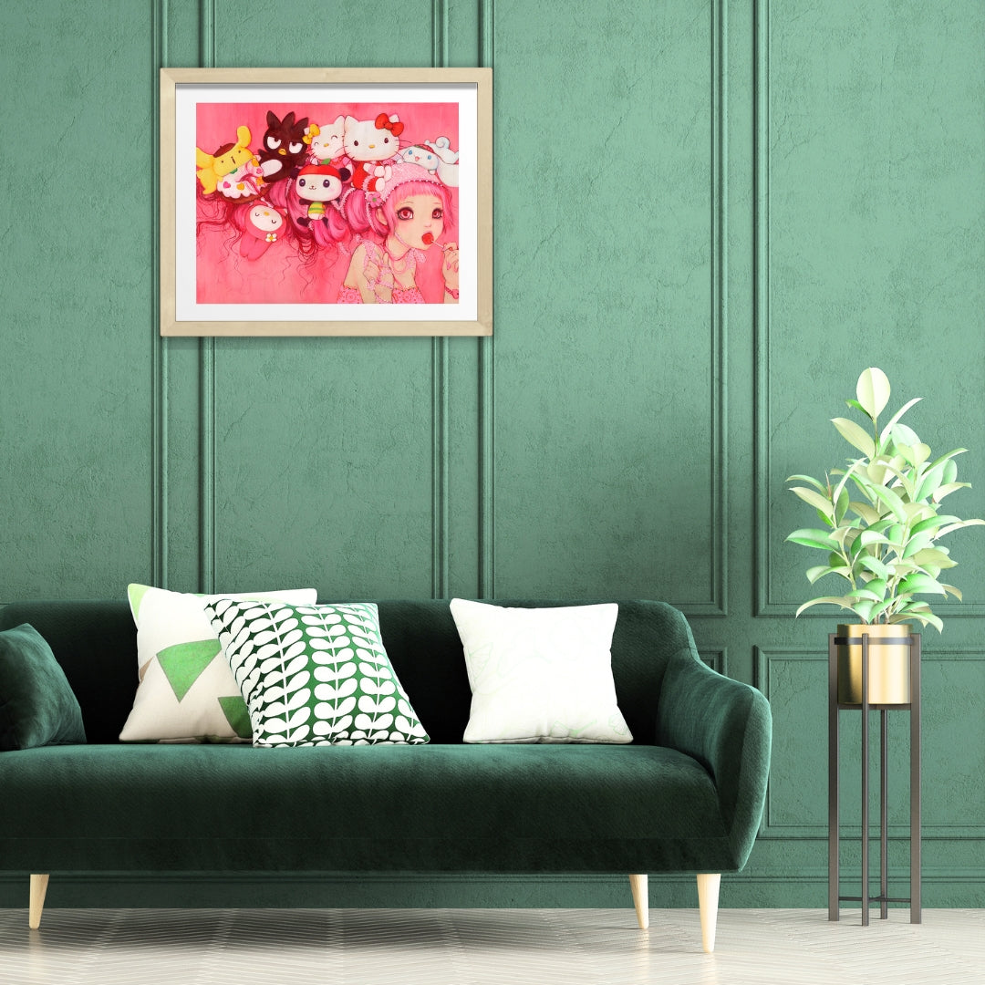 A sugar-sweet swirl of nostalgia and kawaii dreams! In this candy-coated wonderland, a dreamy-eyed girl with cotton-candy hair carries her favorite Sanrio friends in a whimsical tangle of pink strands and playful memories. From Hello Kitty to Cinnamoroll, each character is a sprinkle of joy atop this confection of cuteness. This piece is a love letter to childhood whimsy, sweet treats, and the magic of imagination — with a lollipop in hand and hearts in her eyes, she’s the queen of her own adorable universe.