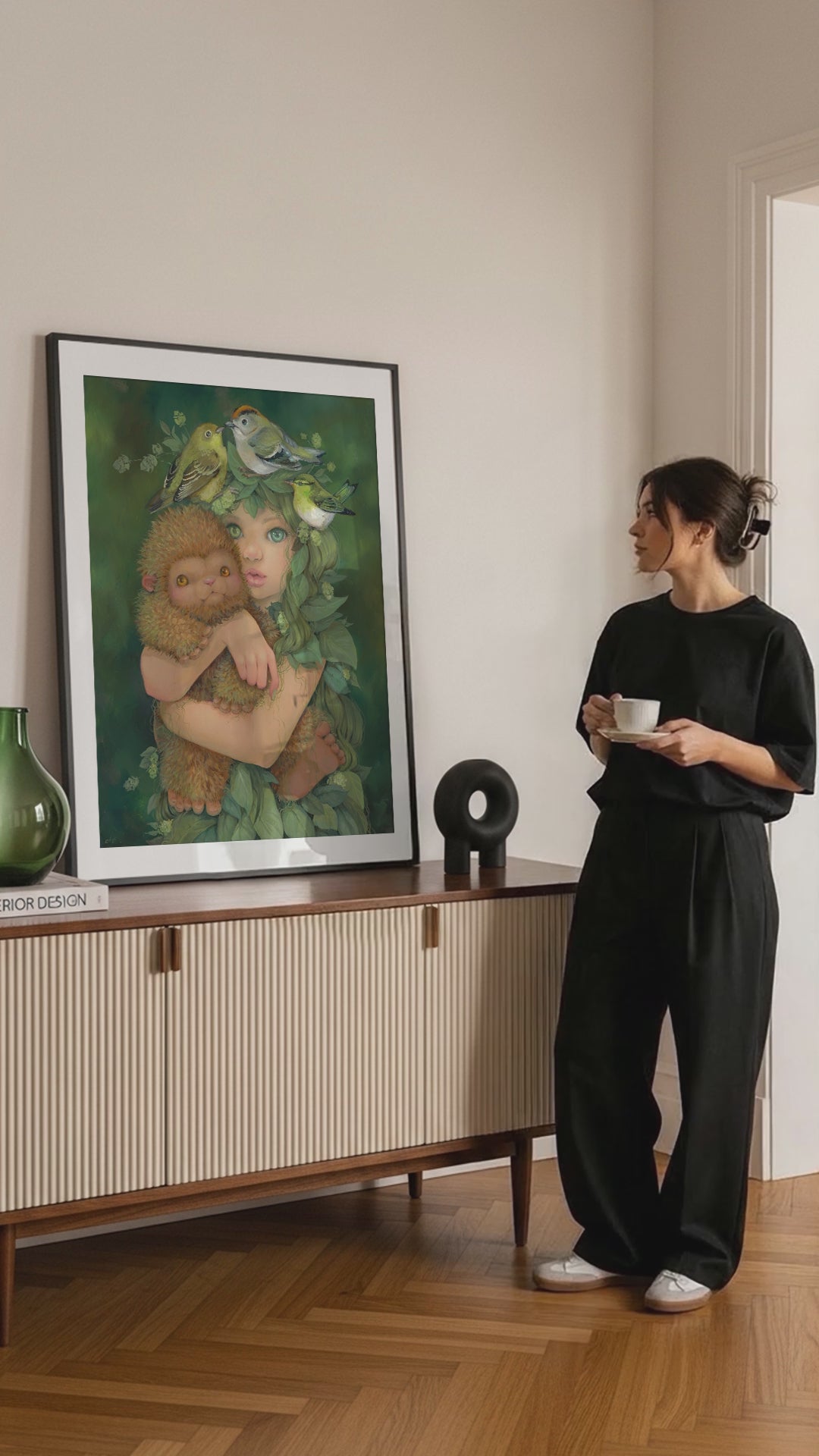 Keeper of the Hidden Kin is a gentle, magical portrait of forest love and hidden friendships. Mother Nature cradles a tiny Bigfoot in her arms—her secret companion from deep within the wild. Birds and leaves drift through the scene, adding a serene glow that feels like stepping into a fairy tale.