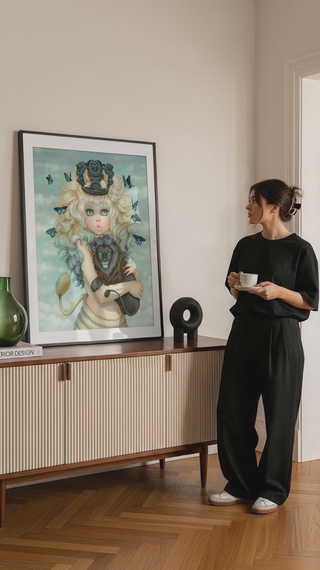 Leos love to be at the center of attention, appreciating compliments and flattery. Confident and proud they are the regal sign. Their happy and outgoing attitude makes them fun to be around and will have a large group of adoring friends. This painting is my love song to my husband who is a Leo. I created her as a tribute to him, one blue eye like my husband’s and one green eye like my own to connect our two souls into one. The black lion shows the fierceness of his heart and intensity of his loyalty.