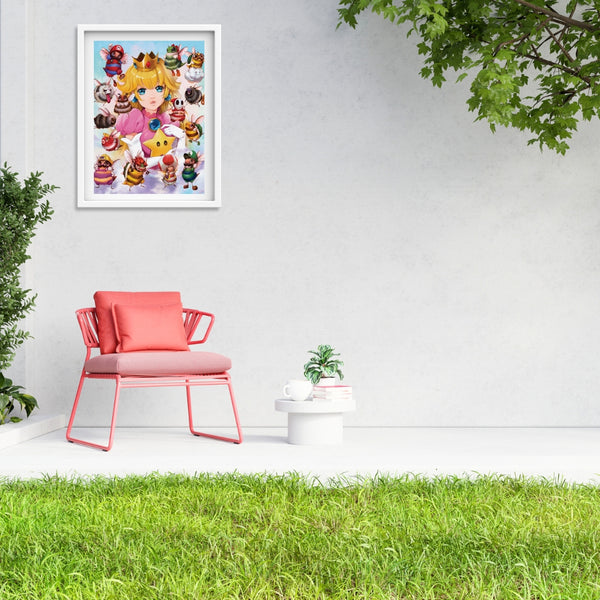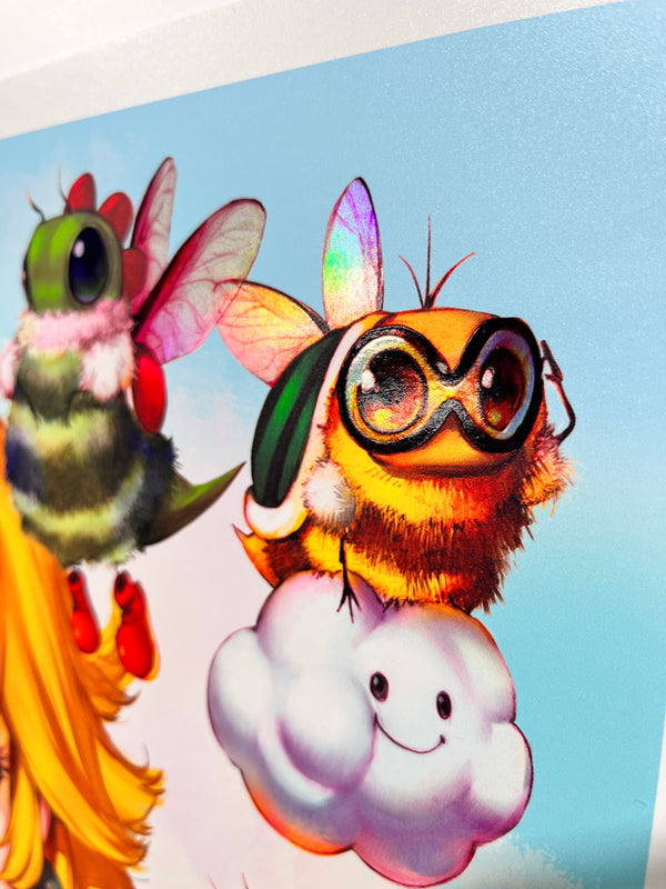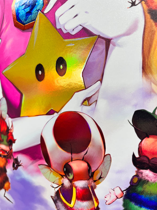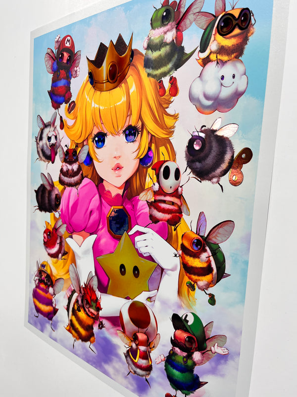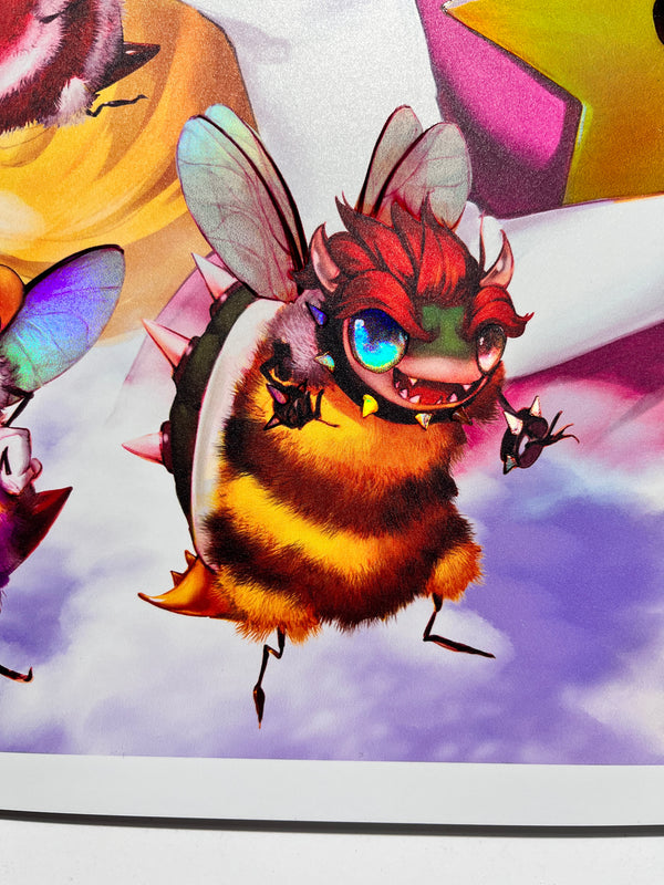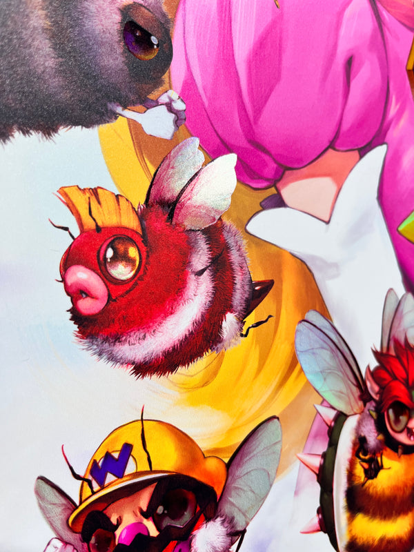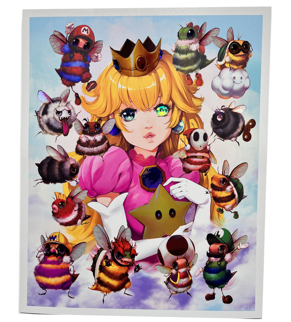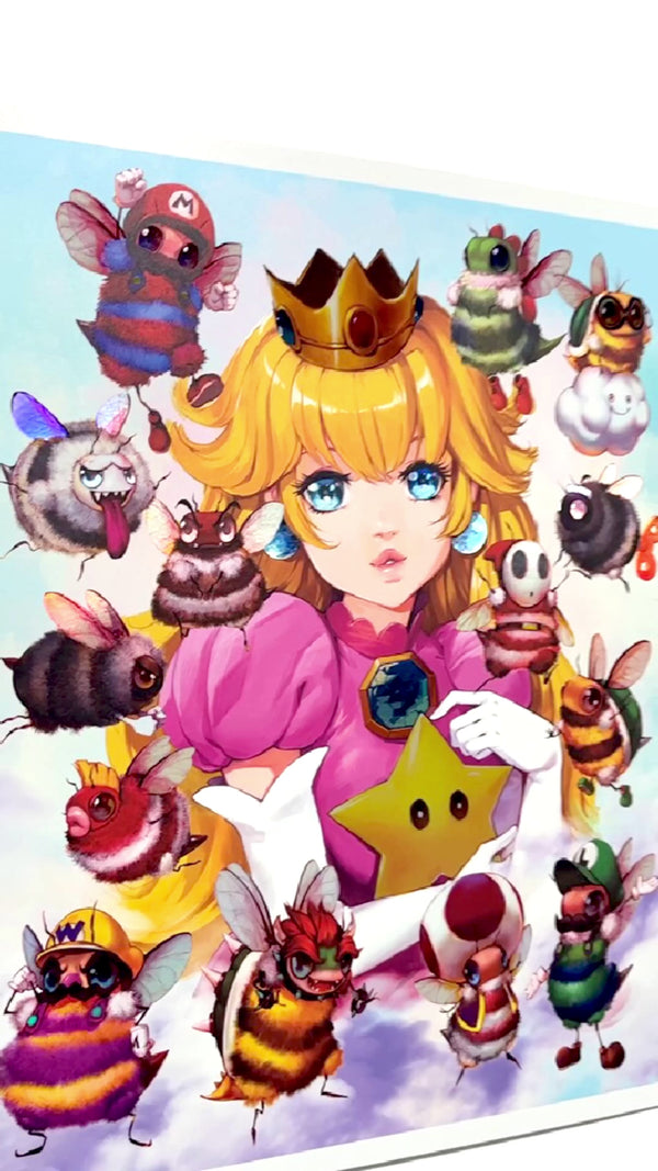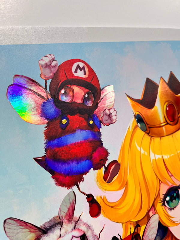 Introducing the enchanting Peach Fuzz Print - a captivating 16x20 holographic masterpiece that brings the beloved Super Mario characters to life as adorable bees! This delightful collectible showcases the charming Mario Bruzz, as it diligently gathers Marbeeo and Lubeegi alongside the entire cast of the Mario Bros world.Each Peach Fuzz Print is a limited edition with only 200 pieces, exquisitely signed and numbered, and comes with a certificate of authenticity to ensure its uniqueness and value. You won't find this mesmerizing piece anywhere else - it was exclusively available at San Diego Comic-Con and once this sold out, it won’t be remade again.