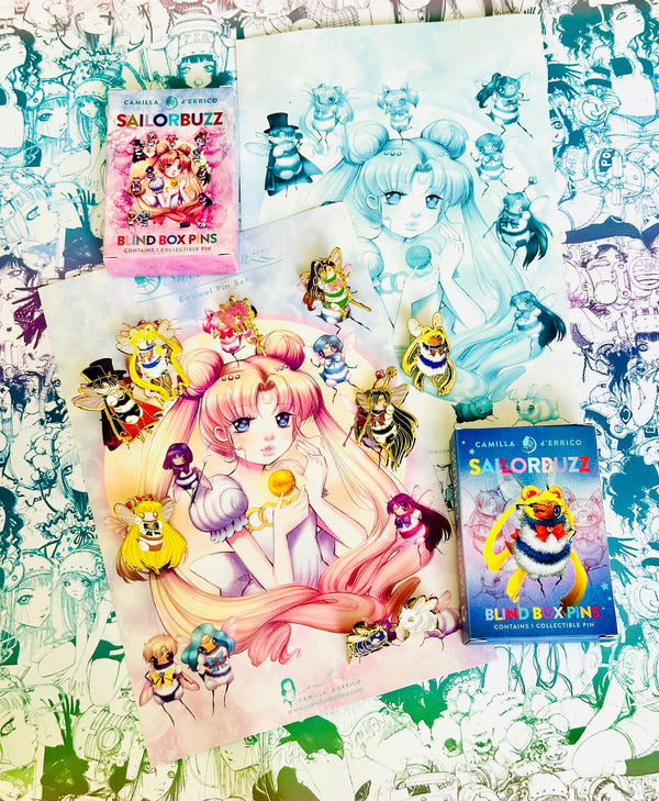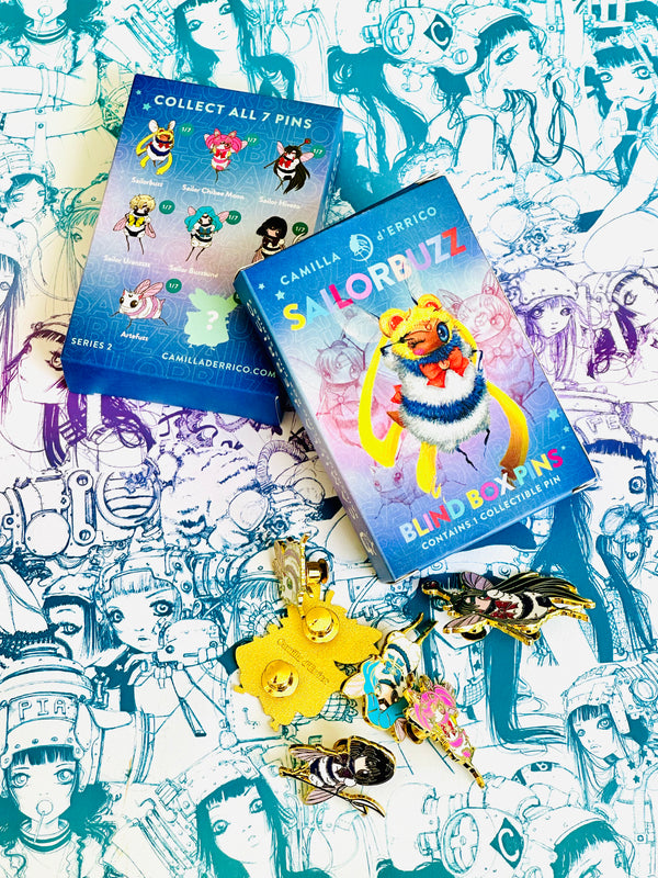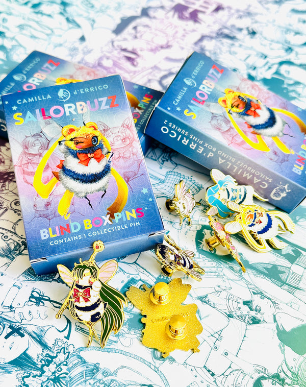Introducing the Sailor Buzz Series 2 Mystery Pins! This second series blind box pin collection features the outer sailor soldiers along with Sailorbuzz and Chibee-moon, perfect for Sailor Moon and anime fans. Inspired by my Fuzzbutt Senshi Hive image, these pins bring the enchanting world of Sailor Moon into beautiful and collectible pieces. Each blind box holds a sailor surprise, inviting you to join the magical journey of completing your extraordinary Sailor Buzz Pin collection. Plus there is a mystery chase pin to collect that you’ll only discover if you are one of the lucky 50 people to get one! Don’t miss out on adding these unique pins to your collection!