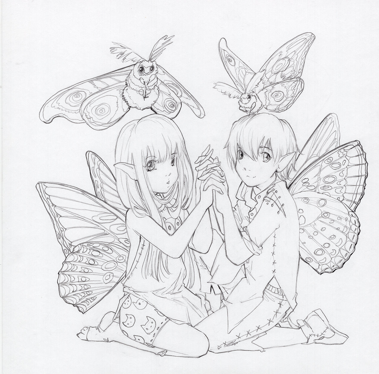 When moonlight meets morning dew, Night and Day come out to play. This enchanting graphite drawing captures a pair of butterfly-winged besties—one wrapped in soft shadows and crescent moons, the other glowing with sunrise vibes. Holding hands in a mirrored pose, they celebrate balance, friendship, and a little bit of fae magic. With fuzzy moth companions fluttering above, it’s a nighttime sleepover and daytime adventure all in one! A flutter-filled tribute to harmony, transformation, and the beauty in opposites.