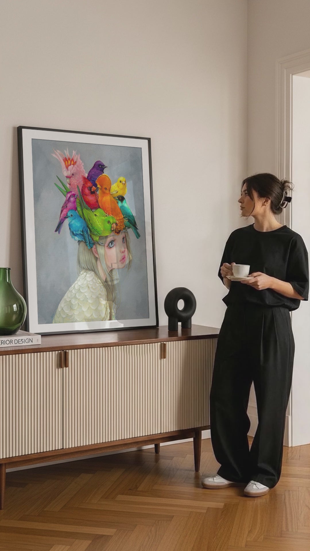 My childhood in the '80s had me falling in love with all things iridescent, neon, and bold. Since I also adore birds, I was inspired to incorporate them into this painting featuring a beautiful girl surrounded by rainbow-tastic, lifelike birds, for my solo show, Nurtured by Nature. Sometimes, the picture in your mind doesn’t always match the painting, but with Tropical Bunch, she is everything that I imagined and more.