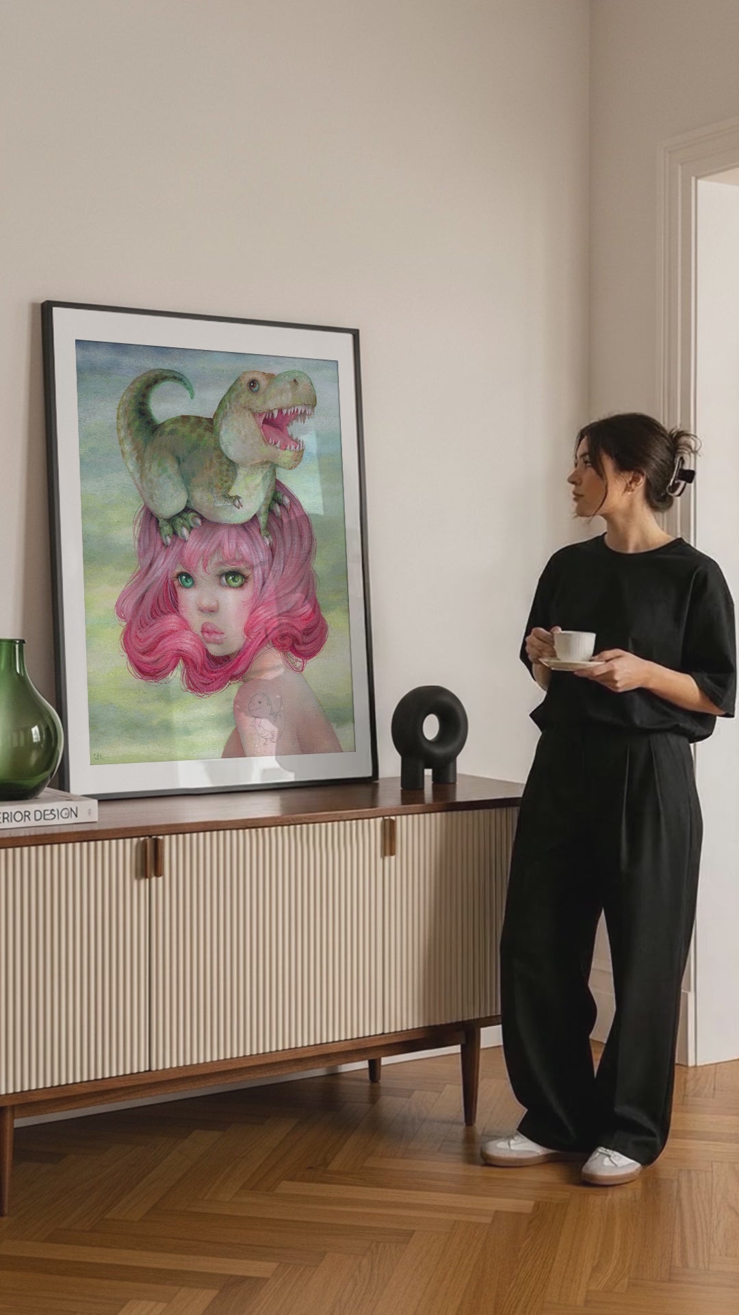 Do you have a favorite dinosaur? If you're like me, it's all about the mighty Tyrannosaurus Rex. Ever since childhood, my fascination with this iconic creature has only grown stronger, thanks in part to the epic scenes from Jurassic Park! Now, you can also bring this majestic dinosaur into your own space with our customizable T-Rex-themed print of my painting image Tyrannical Tyra. Choose your preferred size and paper type to perfectly match your décor and style. Additionally, for a more versatile option, you can opt for the digital laser print on non-fine art paper, measuring 11 x 14 inches. Whether displayed in your home, office, or any space that needs a touch of prehistoric charm, this print is sure to captivate and inspire.